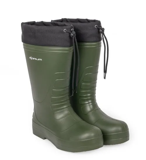 Lehké a odolné holínky Korum z tvarovaného EVA materiálu s tepelnou vložkou a protiskluzovou podrážkou Použití speciálního tvarovaného EVA materiálu nám umožnilo vytvořit velmi lehkou botu typu wellington s pohodlnou tepelnou vložkou.Podrážka je vyrobena z odolného materiálu TPR, který nabízí větší odolnost a přilnavost.
