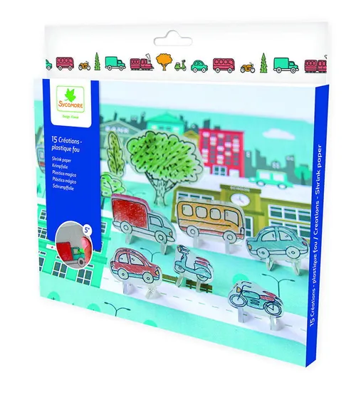Pusťte se do zábavného tvoření se smršťovací fólií! Děti si vyrobí malé modely dopravních prostředků. Podle šablony, kterou položí pod fólii si nakreslí a vybarví vybraný model auta nebo motorky. Ten děti poté vystřihnou a s pomocí rodičů pak obrázek nechají krátce zapéct v troubě. Z fólie se po zapečení stane malý, lesklý a pevný obrázek. Tato kreativní aktivita je vhodná pro malé tvůrce od 5 let, kteří budou nadšení ze svých vlastních uměleckých výtvorů. Návod: 1. Umístěte obrázek pod smršťovací folii hladkou stranou dolů a obkreslete vybraný motiv na matnou stranu folie 2. Vybarvěte pomocí fixu nebo pastelek 3. Vystřihněte 4. Pečte v elektrické troubě na 170°C - 2 až 7 minut, doba pečení závisí na velikosti tvaru. Plast se během pečení několikrát deformuje. Jakmile se obrázek vyrovná, vyjměte jej z trouby. Během chlazení doporučujeme zatížit. Při zapékání musí dětem asistovat dospělá osoba! Balení obsahuje: 2 listy potištěného papíru s 12 různými modely, 4 listy průhledného smršťovací folie (16,5 x 22 cm), návod k použití. Rozměry balení jsou 23 x 21,5 x 1,5 cm. Upozornění: Nevhodné pro děti do 3 let. Používat pod dohledem dospělé osoby. Obsahuje malé části, hrozí nebezpečí spolknutí nebo vdechnutí. Sledujte piktogramy.
